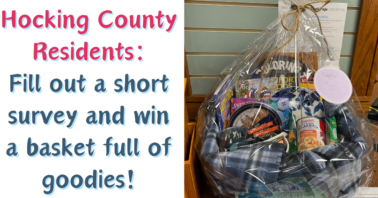 Because this survey is connected to the library's outreach services in Hocking County, we ask that you only complete the survey if you are a Hocking County Resident 18 and over. Hocking County residents-please fill out this survey so we can improve the library's outreach services. Every resident who completes the survey will be entered in a drawing for the outreach basket filled with goodies. You can access a digital copy of the survey using the link below, or you can stop by the Logan or Laurelville branch and complete a paper survey. We will collect responses through Friday, April 12 at 3 pm, and will be drawing the winner's name at 4 pm.