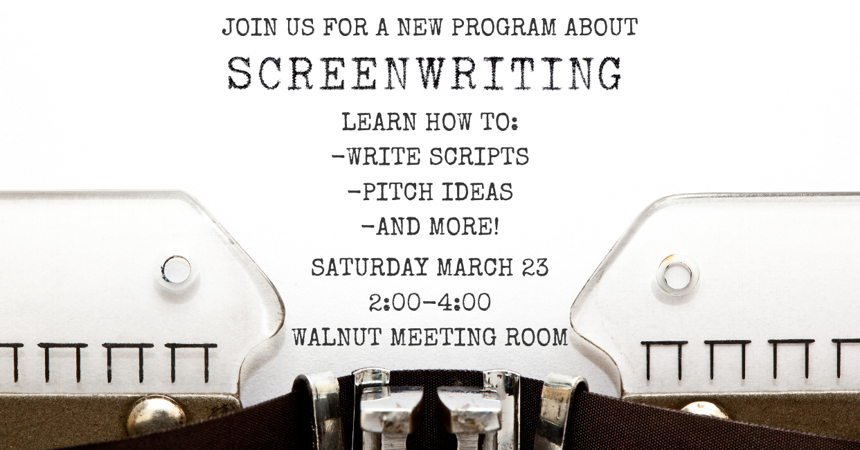 Join us on Saturday, March 23 from 2:00-4:00 PM in the Walnut Meeting Room for our new screenwriter program!